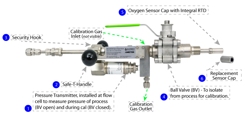 Figure 1 shows the SafeTap II assembly with an optional pressure transmitter (1) for continuous pressure measurement and calibration. The BOS SafeTap II oxygen sensor includes a Pt1000 RTD (5) for Class 1 Div 2 and Zone 2 or an external RTD for Zone 1 and is rated up to 750 psig (51.7 Bar). Tubing ports allow for in situ calibration and 450 psig (31.0 Bar) in retracted mode without removing the sensor.